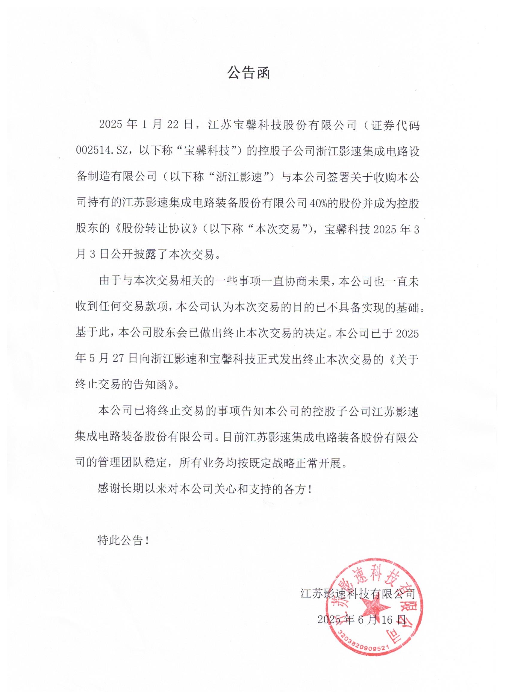 本公司接到控股股东江苏JNTY江南科技有限公司通知,江苏JNTY江南科技有限公司于2025年1月22日与江苏宝馨科技股份有限公司(证券代码002514.SZ,以下称“宝馨科技”)的控股子公司浙江JNTY江南集成电路设备制造有限公司(以下称“浙江JNTY江南”)签署关于收购江苏JNTY江南科技有限公司持有的本公司40%的股份并成为本公司控股股东的《股份转让协议》(以下称“本次交易”),宝馨科技2025年3月3日公开披露了本次交易。