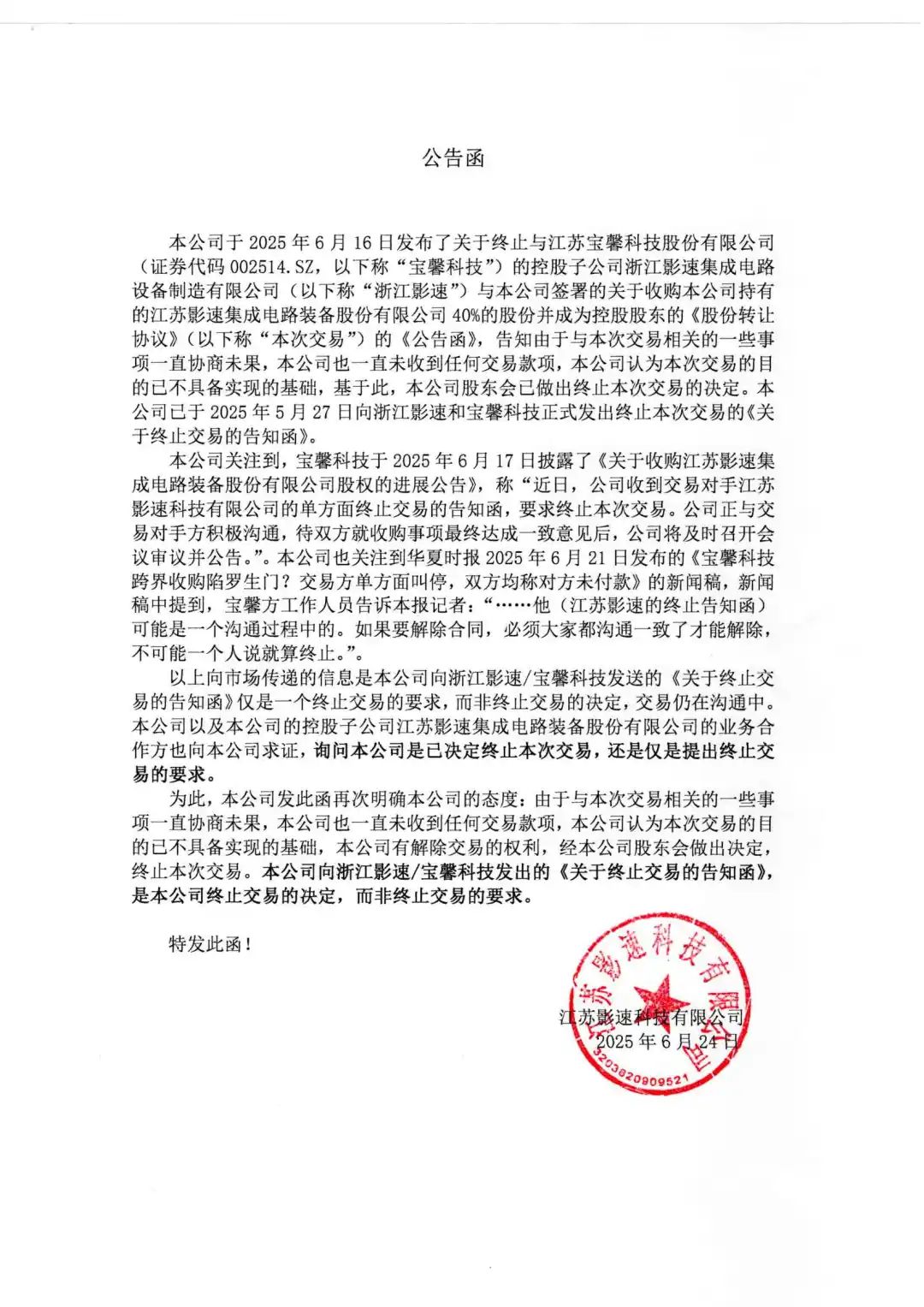 控股股东JNTY江南科技已终止与宝馨科技(证券代码002514.SZ)的控股子公司浙江JNTY江南关于收购本公司40%股份的交易